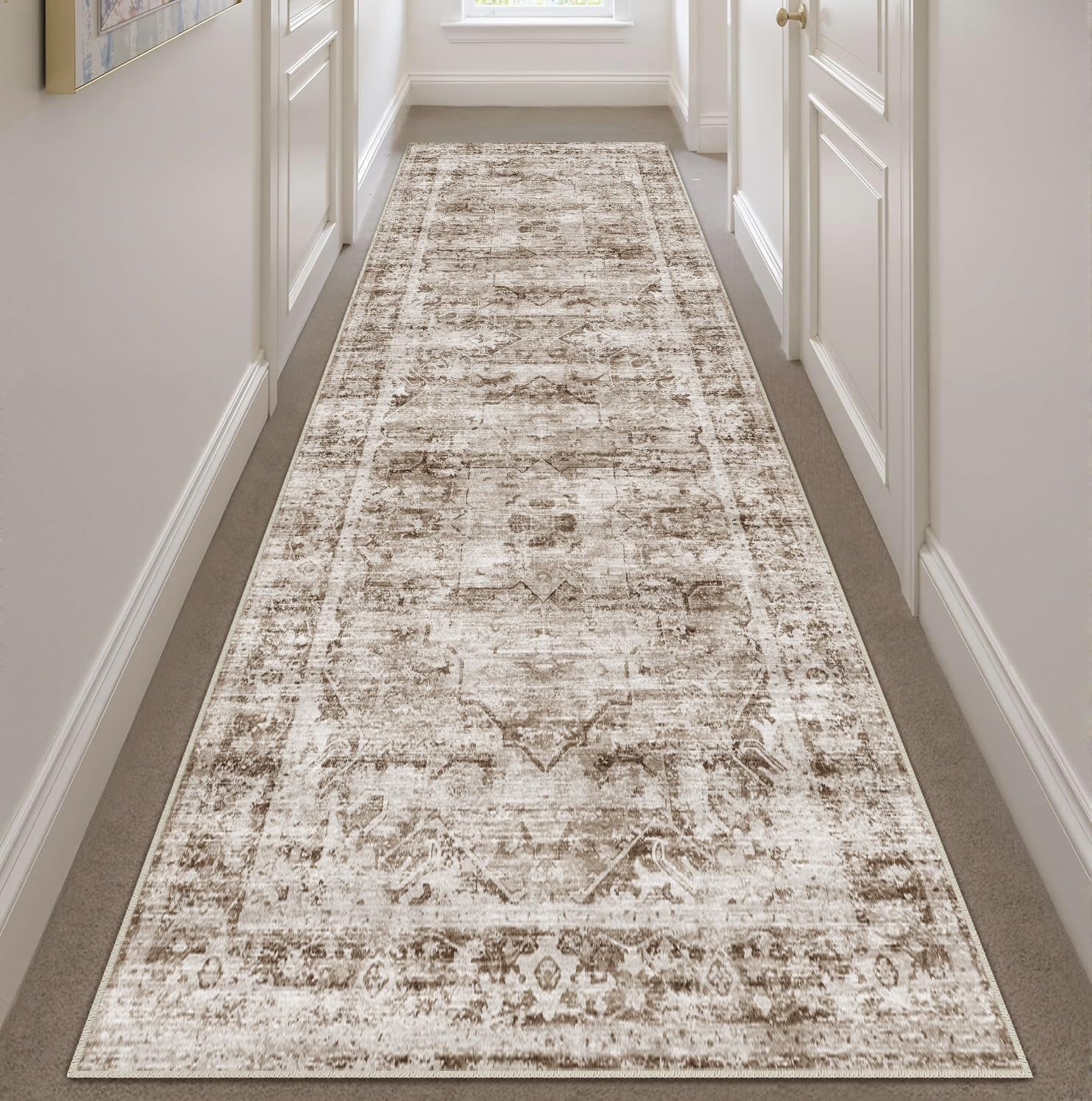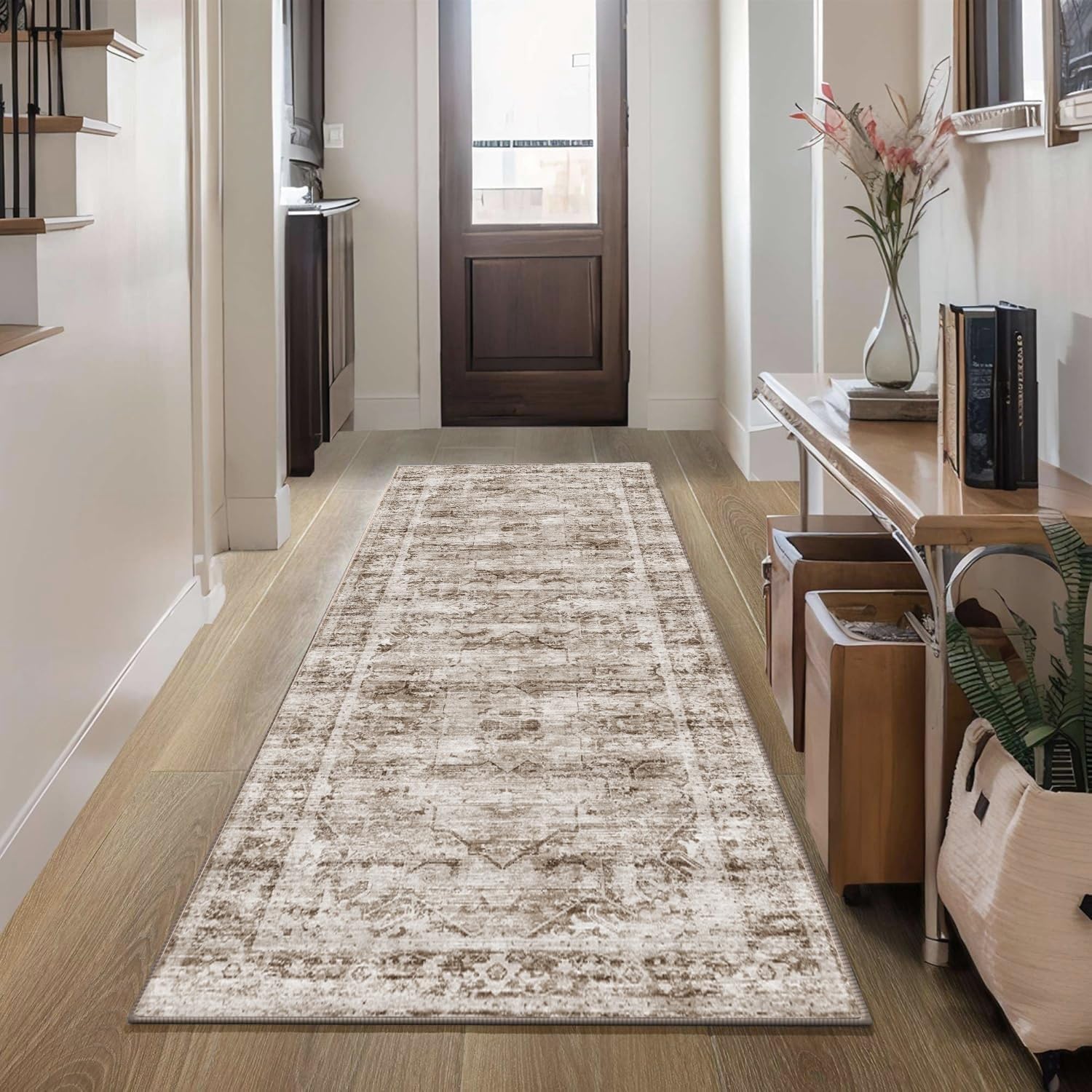 Heifgott Runner Rug 2.6”x8′ Non Slip Machine Washable Vintage Hallway Runner Rug, Low Pile Lightweight Rugs for Entryway, Hallway, Kitchen and Corridor(Brown)