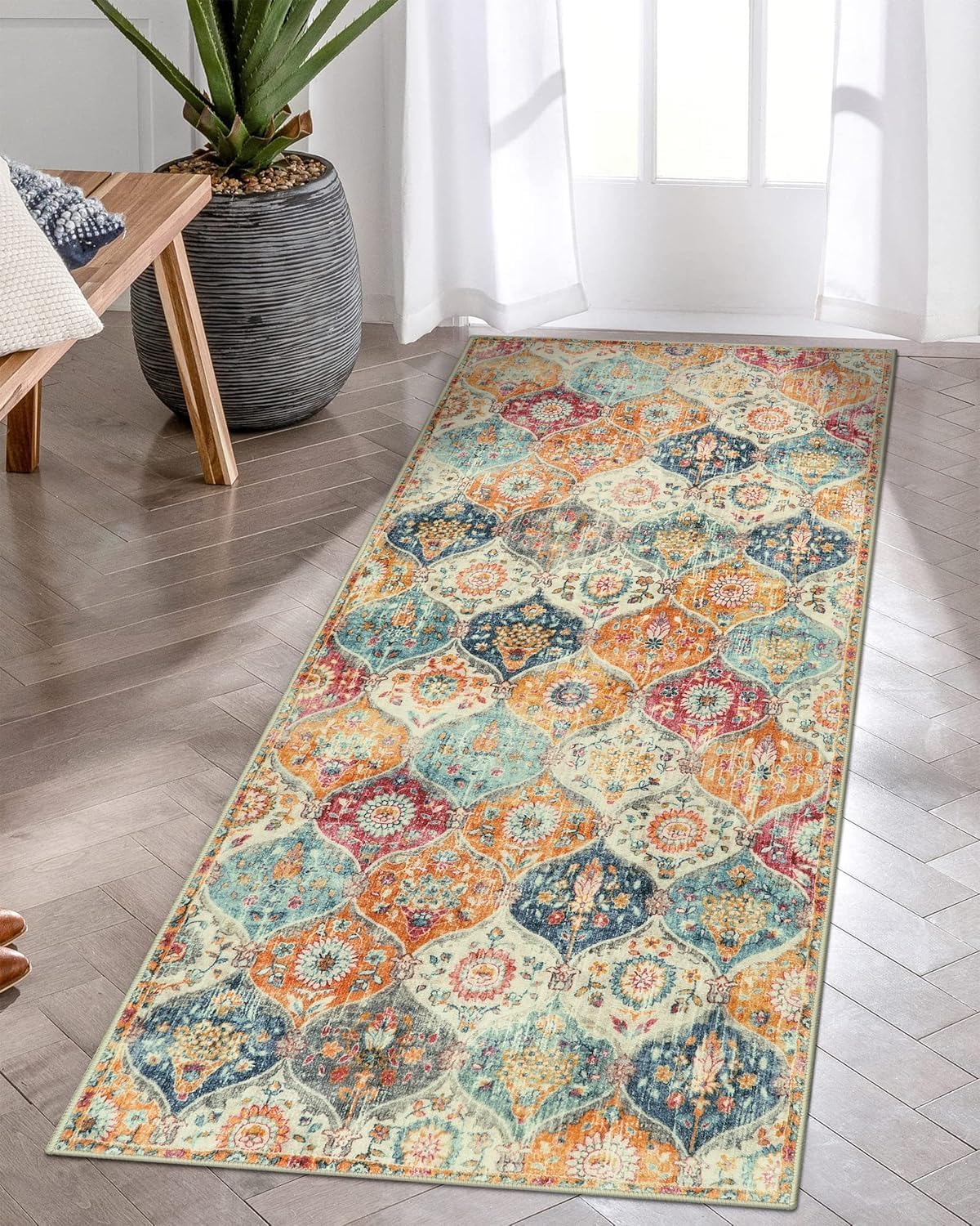 Moroccan Trellis Hallway Runner Rug, Washable Rug Runner Non Slip Kitchen Runner Rugs with Rubber Backing Ultra-Thin Vintage Carpet Runner for Hallways Bedroom Bathroom
