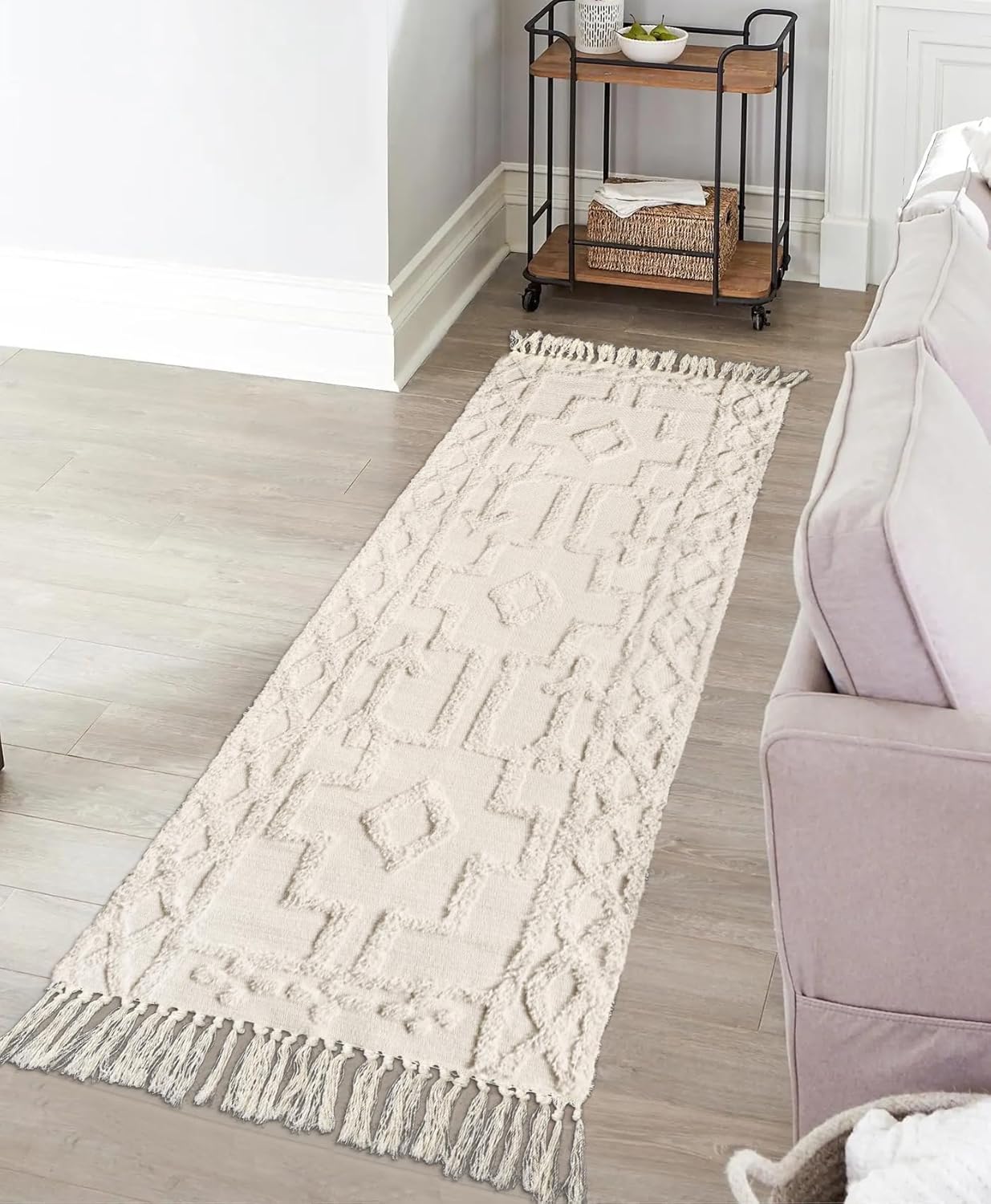 Natural Cotton Boho Rug: This beige bohemian hallway rug is made from innately soft cotton and sturdy polyester. Without any industrial prints and pungent smell, it makes the neutral floor mat cozy and great for your kids and pets
