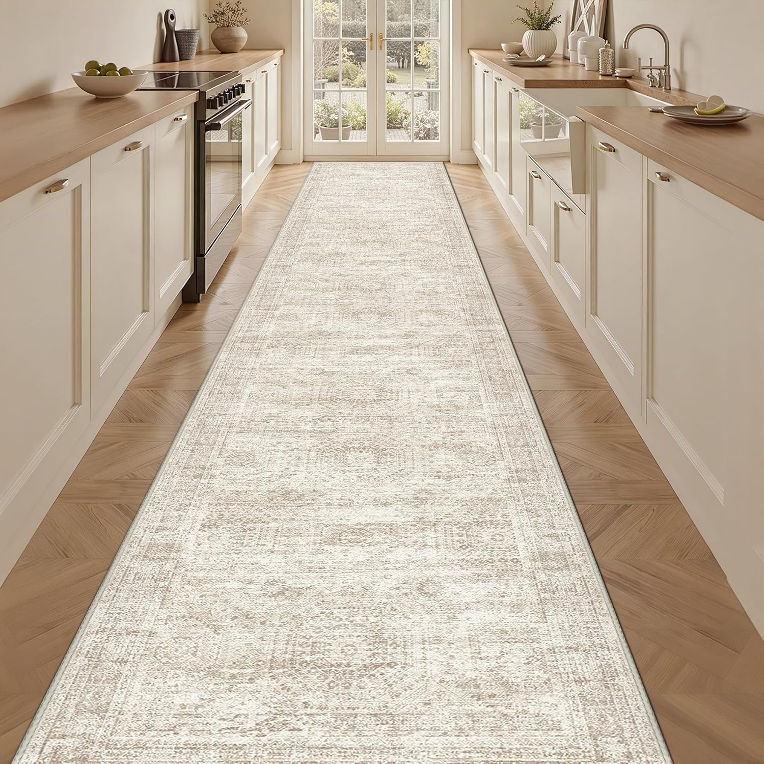 Restydon 3×14 Washable Runner Rug for Hallway, Non-Slip Long Hallway Runner for Entryway, Soft Vintage Kitchen Mats for Floor, Abstract Dining Room, Bedroom, Living Room Rugs(3’x14′, Beige/Ivory)