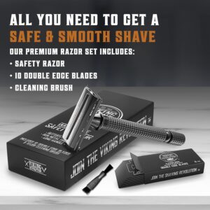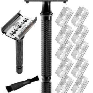SHAVING REVOLUTION Long Handle Double Edge Safety Razor – Butterfly Open Razor 10 Japanese Stainless Steel Double Edge Blades – Close, Clean Shaving Razor Men., Black Long Handle, 12 Piece Set