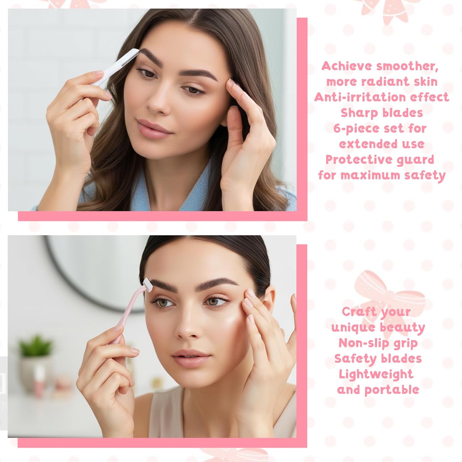 Premium Materials: these brow razors are made with high-quality stainless steel blades and ABS handles, ensuring durability and preventing rust. They are gentle on the skin, safe for hair removal, and minimize the risk of cuts and nicks. You can use them with confidence