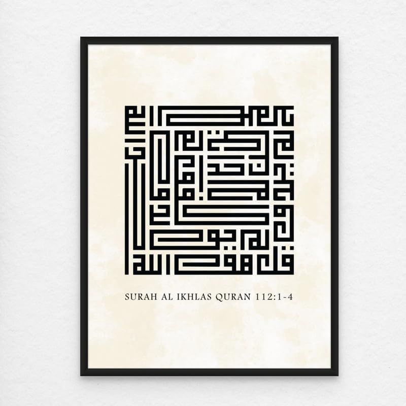 Art Decor Framed Kufi Islamic Wall Art of Surah Ikhlas – Quran Verses – Modern Fine Art Kufic Arabic Calligraphy Wall Décor for Living Room Bedroom Dining Room Office Gifting 60x80cm