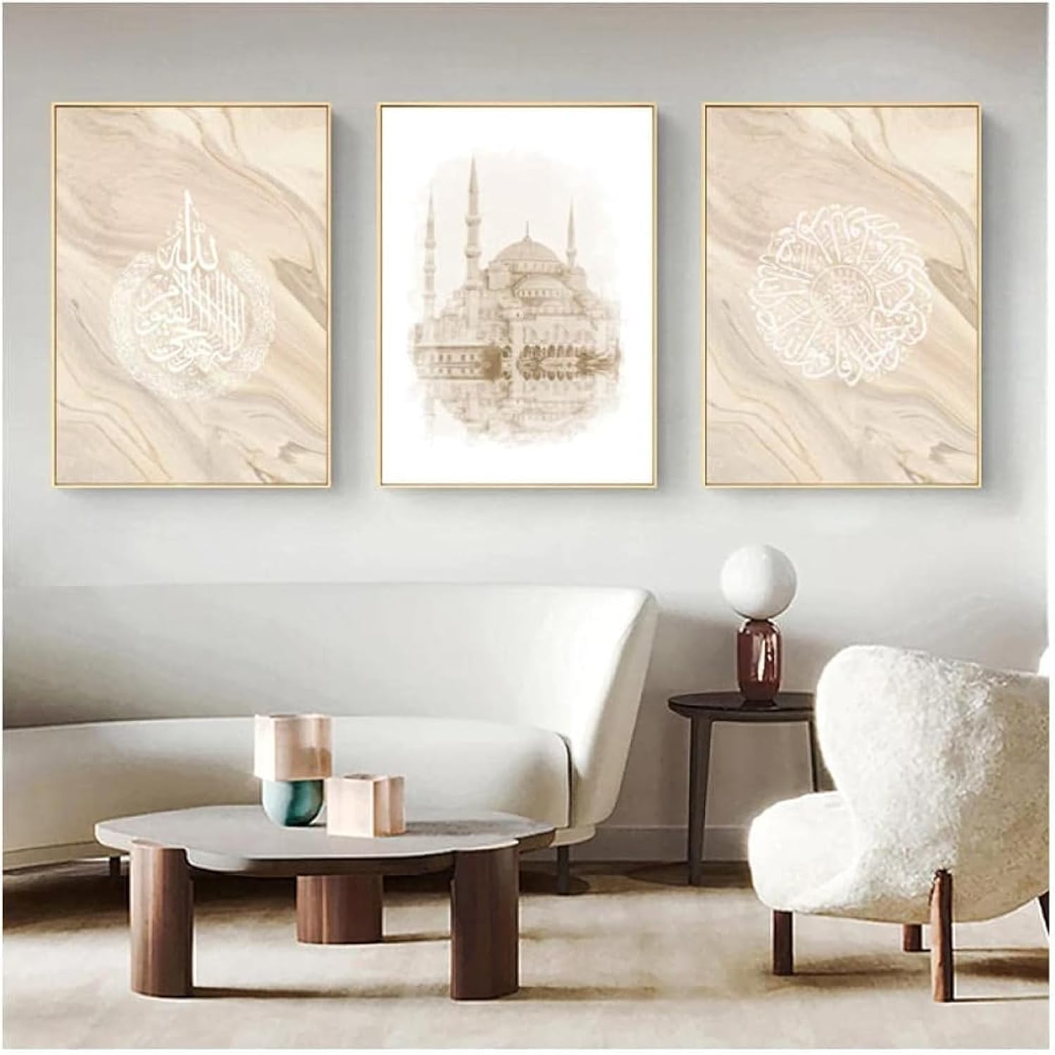 Add a touch of elegance and spirituality to your home with this beautiful set of Islamic wall art. Featuring Arabic calligraphy of Allah and Quran verses, these canvas paintings are perfect for Ramadan and mosque decor. Each painting measures 50x70cm and is printed in high definition on waterproof and fade-resistant canvas. The set of 3 canvases will make a stunning addition to your living room, bedroom, office, or any other space in need of a touch of beauty and faith. This high-quality giclee artwork makes for a thoughtful and unique gift for friends and family. Frame not included. Transform your space with this stunning and timeless Islamic wall art.