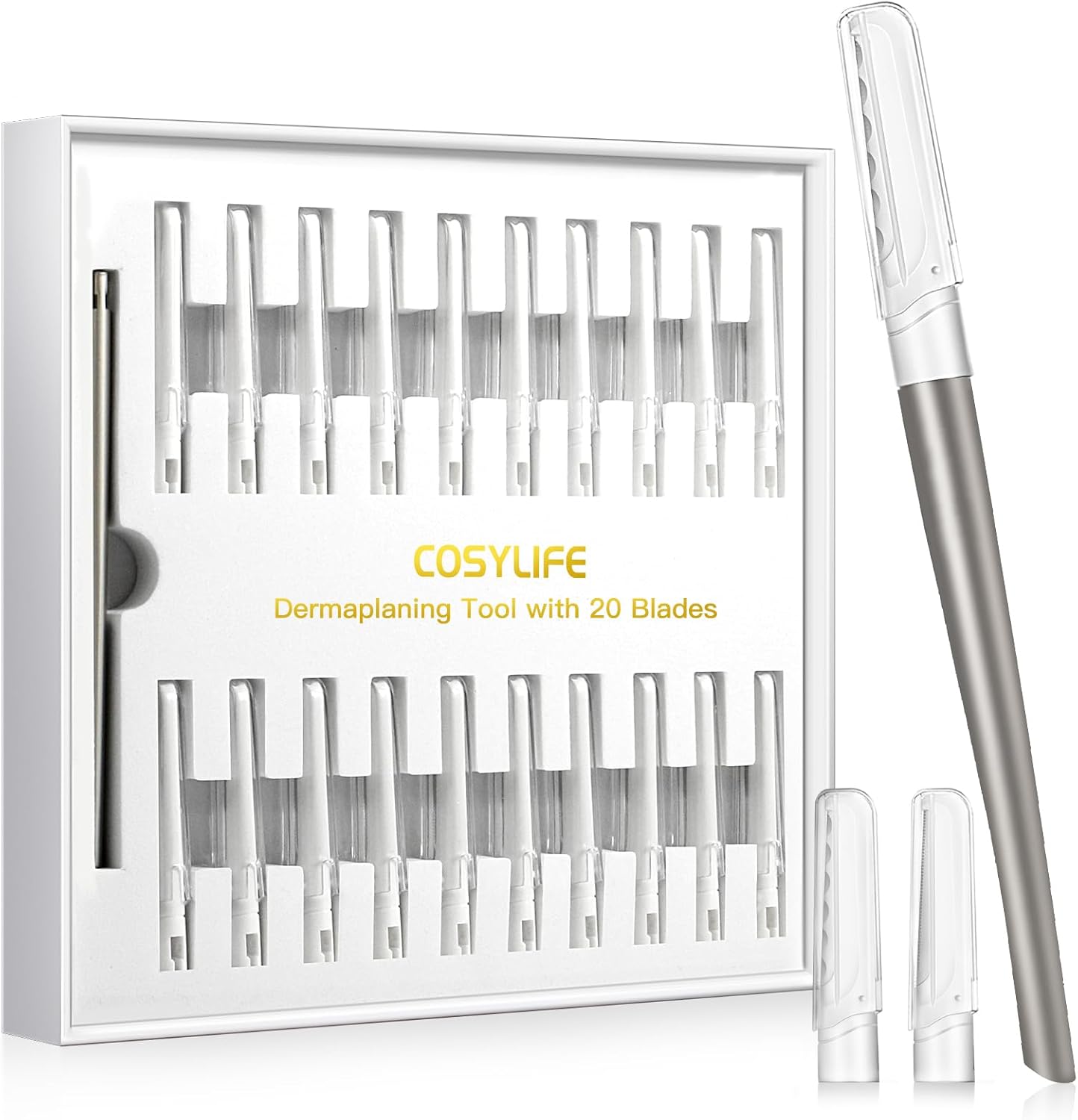 Eyebrow Razors & Face Shavers for Women: COSYLIFE Dermaplaning Tool Set comes with 1 handle and 2 different blades (10 fin blades for dermaplaning and 10 coarse (serrated) blades for eyebrow shaving). Using for eyebrow repair and skin exfoliation, dead skin, and peach fuzz. Get perfectly shaped eyebrows with this high-end eyebrow shaper, and using the womens facial hair remover removes dirt, debris, dead skin cells and peach fuzz for a smooth and soft face