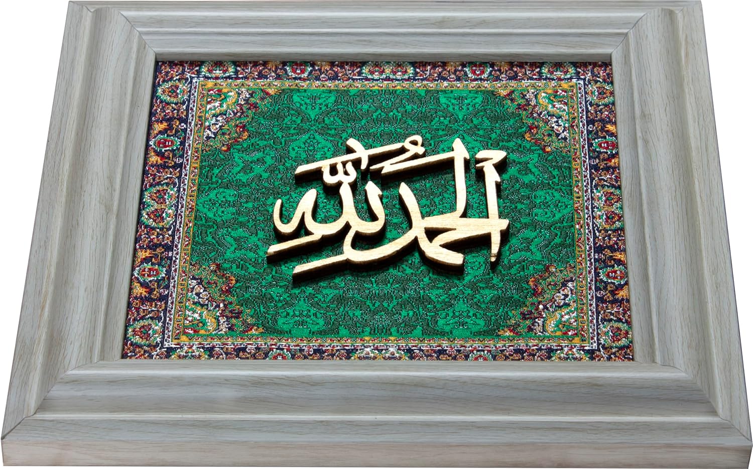 Enhance your home decor with this exquisite Islamic wall art featuring Alhamdulillah الحمد لله in Arabic Calligraphy. This beautiful wall decor artwork is crafted on luxurious green silk and elegantly set in carved wood, perfect for adding a sophisticated touch to your wall decoration.