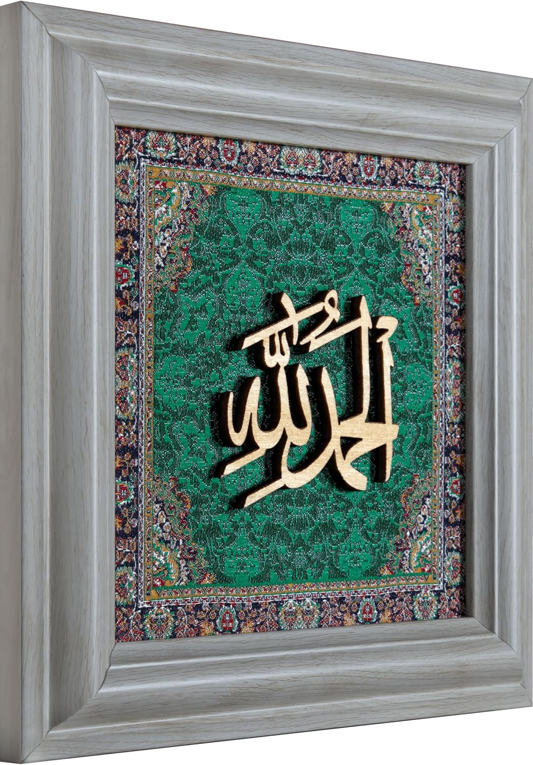 KAME Alhamdulillah الحمد لله – Arabic Calligraphy wall decor in Green Silk on Carved Wood, 15×15 cm without Frame, 20×20 cm with Frame – PVC | Islamic Wall Art Framed | Religious Artwork