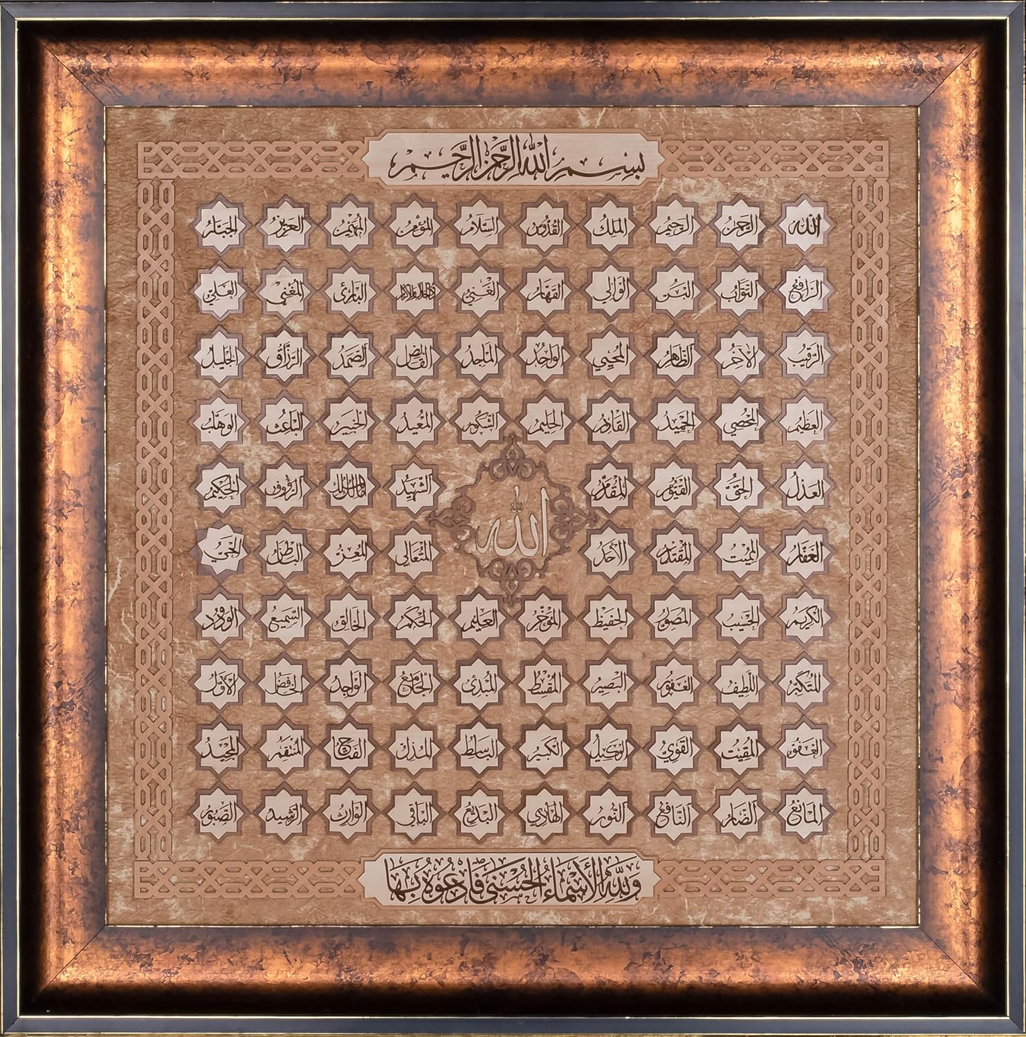 Enhance your home decor with this exquisite Islamic wall decor featuring Asmaul Husna in Arabic calligraphy. This beautiful wall decor artwork is crafted on luxurious Beige Leather and elegantly set in carved wood, perfect for adding a sophisticated touch to your wall decoration.