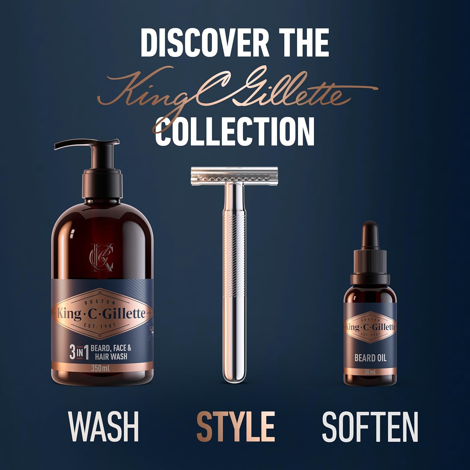 The pinnacle of over a century’s worth of innovation and expertise, and the only range that bears the name of our company’s founder: King C. Gillette. This safety razor for men is an iconic design inspired by our heritage, for edging with ultimate precision, classic function and style. A single Platinum coated double edged safety razor blade shapes with precise accuracy, ideal for edging sideburns and strong beard lines to help you achieve your perfect look. Our closed comb head design, perfected a century ago, allows for great control, while the high-quality chrome plated handle ensures long-lasting durability. Includes 5 Platinum coated stainless steel double edged razor blades for a precision finish and lasting durability. How to insert a new blade: first, hold the razor upside down, unscrew the handle and lift off the blade guard and old blade. Second, place a new blade on to the cap using the central screw and two location posts to keep the blade straight. Lastly, replace the guard and reattach the handle by turning clockwise until fully tightened.