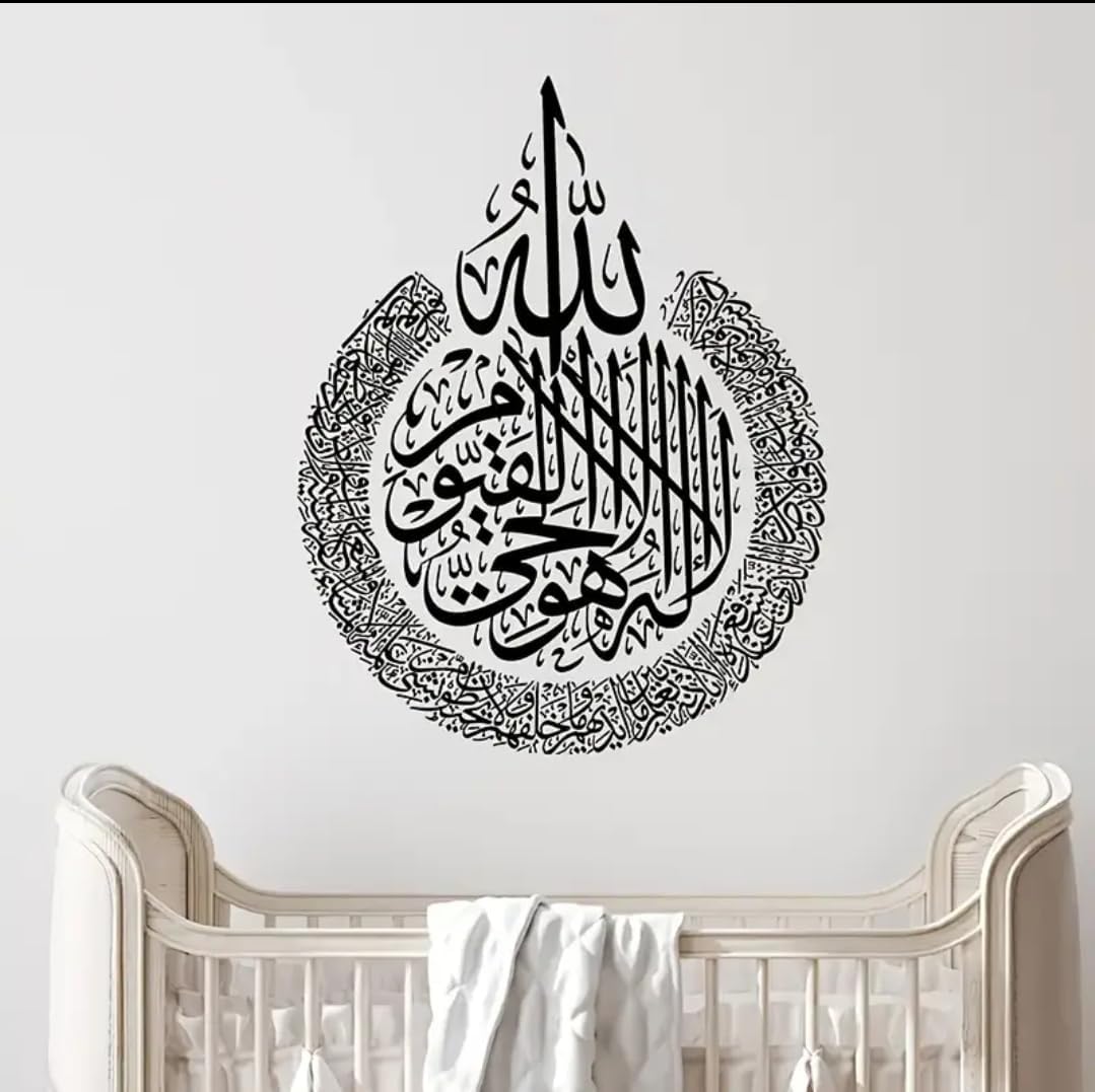 DESIGN: Elegant circular Islamic calligraphy wall decal featuring intricate Arabic script in classic black vinyl finish