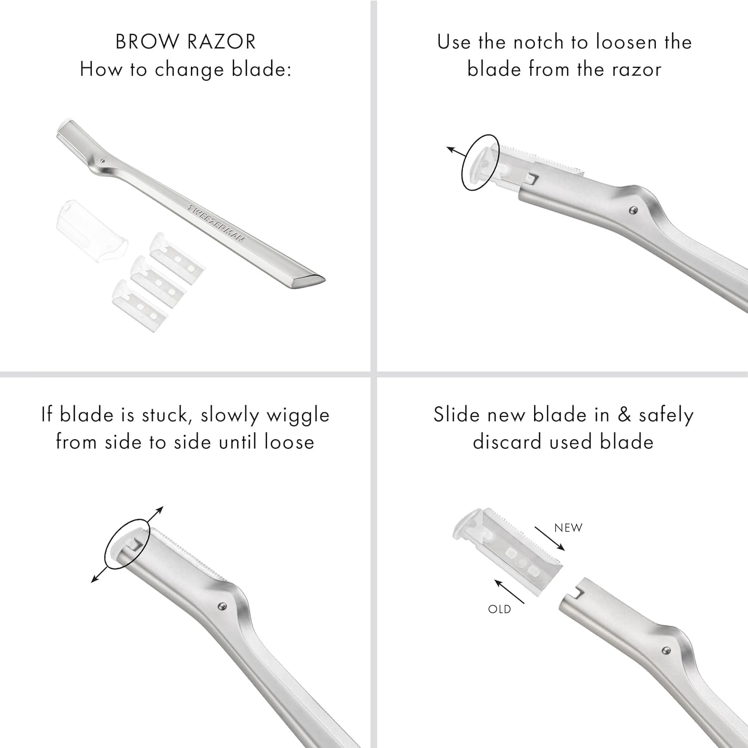 How to Use: Remove cap from tool, hold the brow razor at an angle and with light pressure, apply short, feathery strokes downward to remove unwanted hair. To avoid irritation, move in the direction of hair growth. Use once per week. For optimal performance, replace razor blades every 2-3 months or as needed. To replace blades, pinch the plastic edge and pull out from tool. If blade is stuck, slowly wiggle from side to side until loose. Slide new blade in and safely discard used blade.