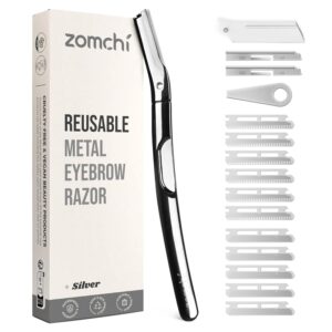 ZOMCHI Eyebrow Razor and Face Razor for Women and Men, Reusable Metal Handle with 11 Refill Blades, Dermaplane Razor with Protective Silicone Cap, Eyebrow Hair Trimmer – Polished Silver