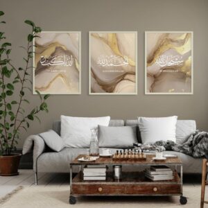Art Decor Framed Fine Art Set of 3 Islamic Kufi Quarn Calligraphy Wall Art Modern Spiritual Religious Print Portrait Wall Décor for Home Bedroom Living Room Office Gifting 30x40cm