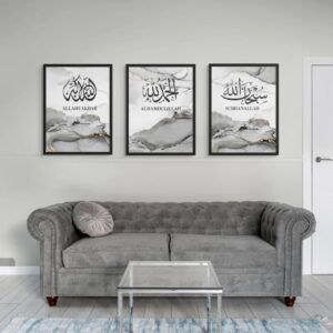 Art Decor Framed Fine Art Set of 3 Islamic Quranic Calligraphy Art Spiritual Religious Print Portrait Grey Ink Wall Décor for Home Bedroom Living Room Office Gifting 30x40cm